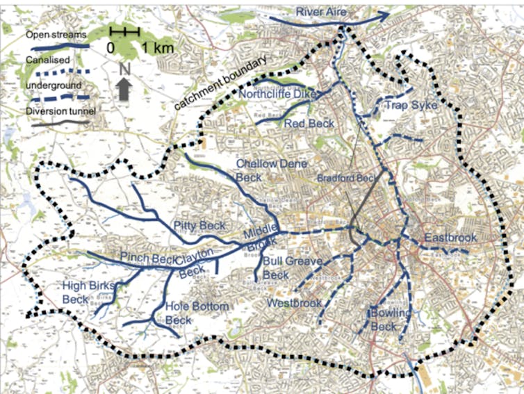 The lost rivers of London are well known, but all cities have them. In my home city of Bradford there is virtually no trace of the small main river, the Bradford Beck, or most of its urban tributaries. In Bradford alone, more than 25km of streams have been covered over and now flow within an engineered structure known as a culvert.